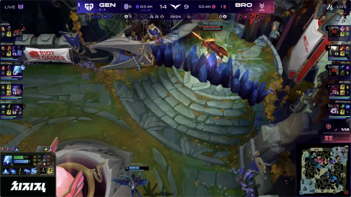 首先来看看今天LCK赛区的两场比赛,GEN和BRO这场,首局BRO在前期拿到了绝对的优势,可惜中期连续几波团战之后,GEN逐渐将经济差抹平,最终在成功拿下大龙后反超经济拿下翻盘局。到了第二局GEN在前期就取得了对线优势,中期也是持续滚大经济雪球,随着不断的入侵BRO野区抓人,GEN将经济差扩大至6k以上,虽然本可以25分钟那波直接一波结束掉比赛,但愣是到了32分钟GEN才成功拿下。